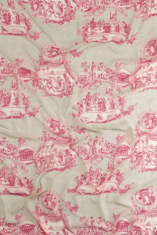 The Ancient Columns Pink Print Is Inspired By Classic French Toile De Jouy Fabrics But With A Twist. It Features Delicate Sketches And Detailed Scenes Of Ancient Roman And Greek Architecture.